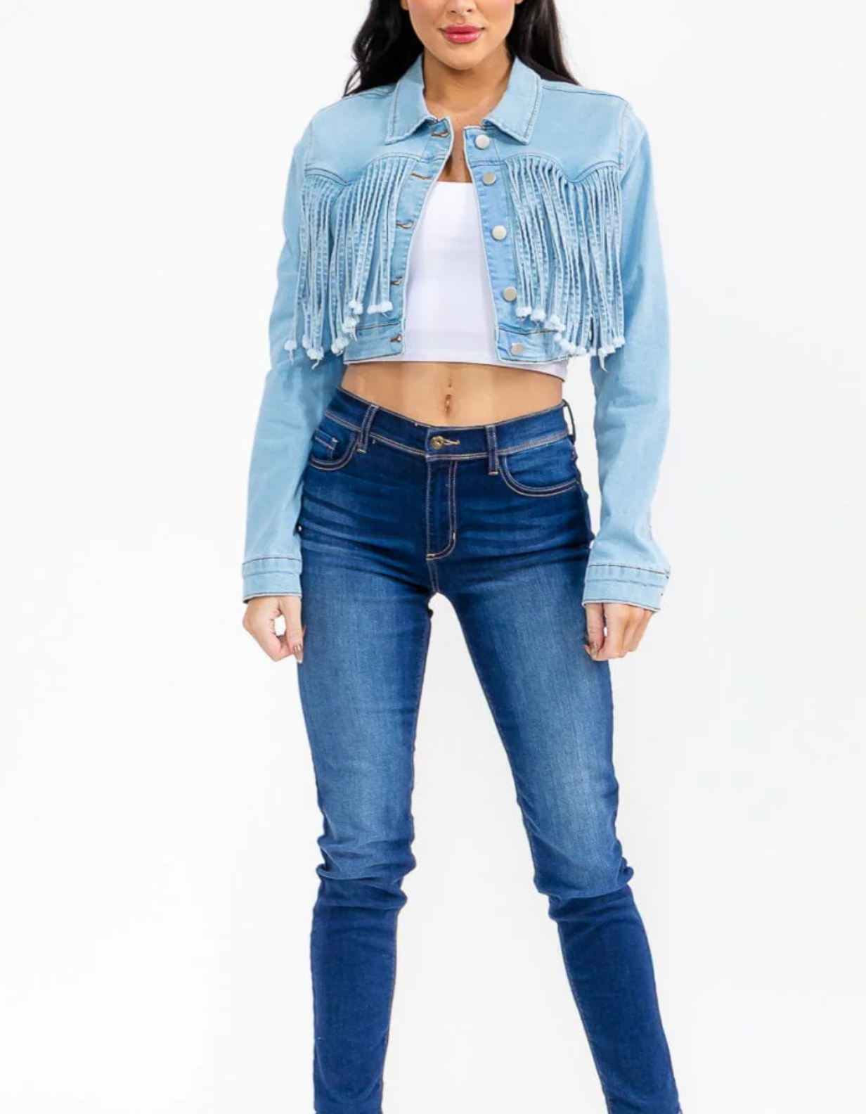 Cowgirl Cutie is a cropped light-wash denim jacket with playful fringe detailing across the front.