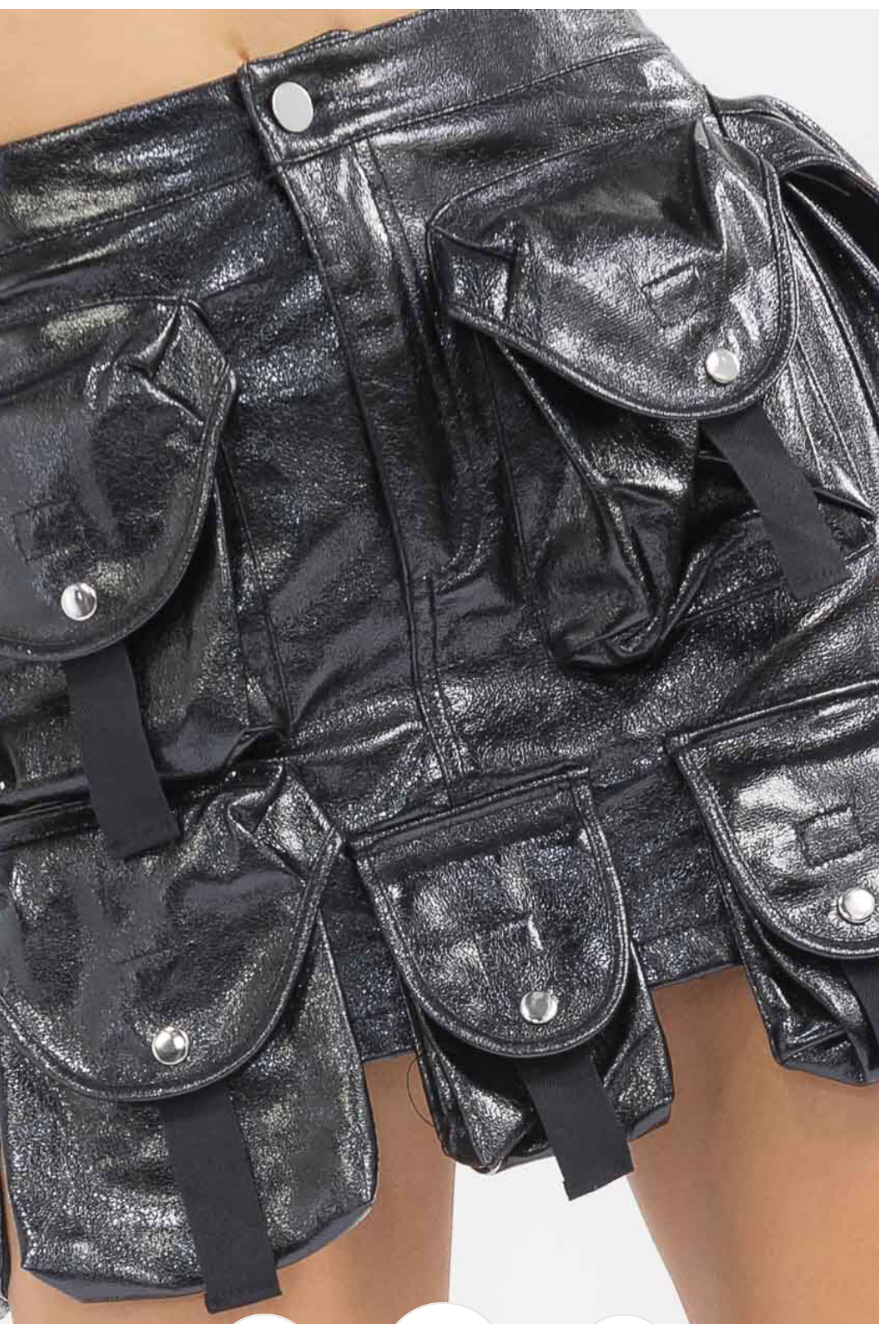 Pocket Play is a bold faux-leather mini skirt designed with layered cargo pockets for an edgy, street-ready look.