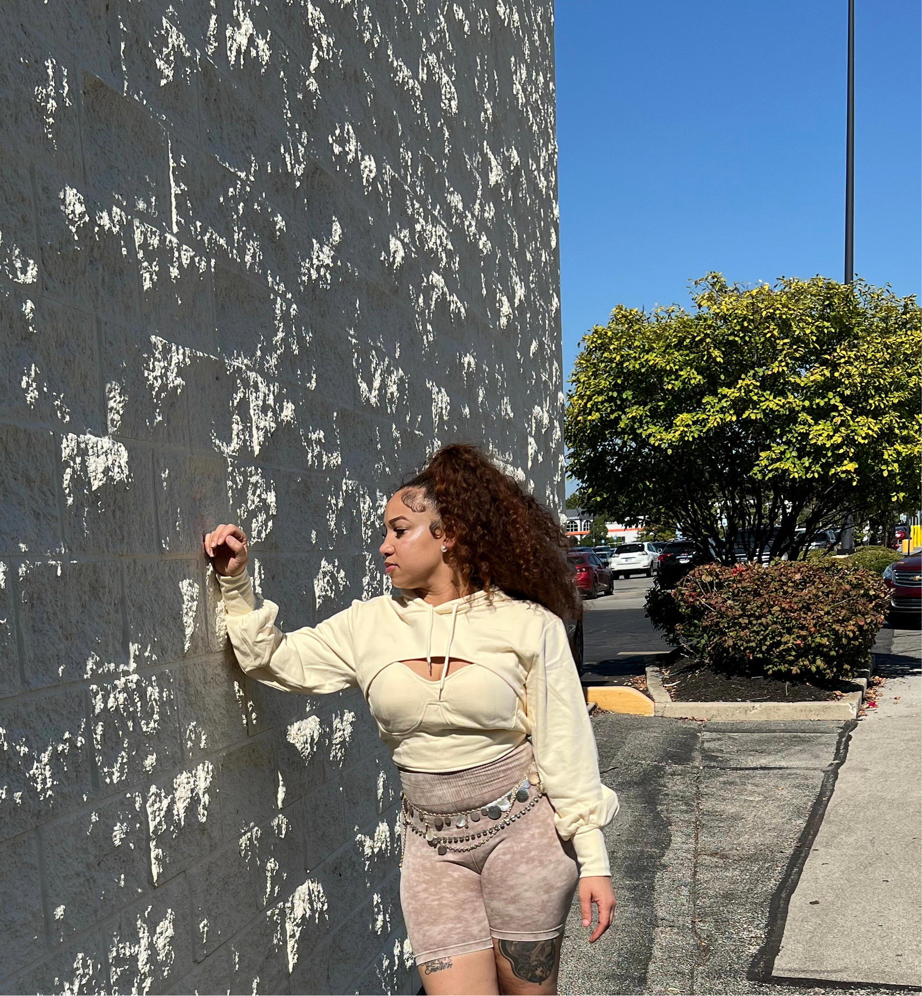 Cropped hoodie with bustier inspired cutout. Soft knit fabric meets structured contouring for a look that balances casual comfort with bold detail.